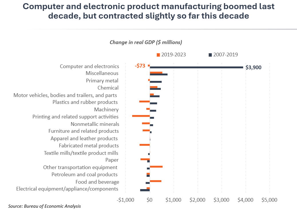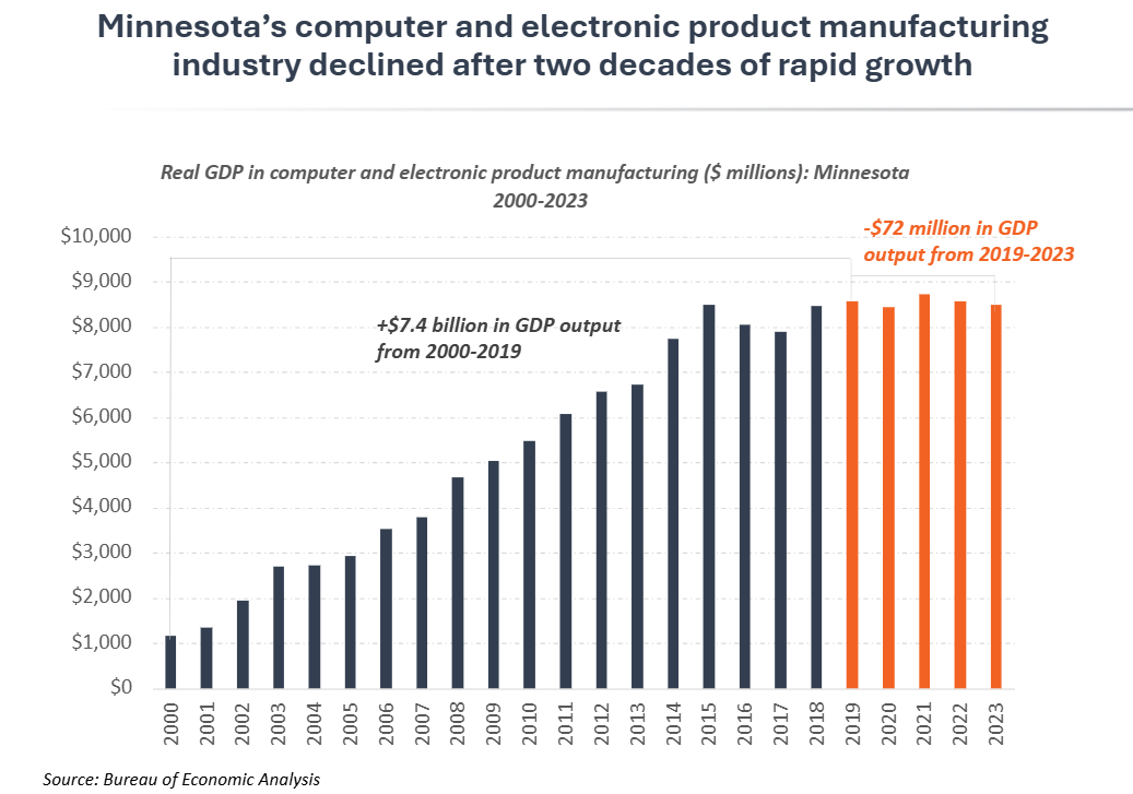 Minnesota’s manufacturing slowdown this decade was due in part to a decline in its computer and electronic products subsector, which had been an engine for manufacturing growth in recent decades. Minnesota’s computer and electronic products industry represents some of the state’s most advanced manufacturing activities. This subsector includes manufacturing of electromedical devices, semiconductors, circuit boards, computers, storage devices, industrial controls and more. From 2000-2019, it accounted for nearly 60% of Minnesota’s overall manufacturing growth, expanding at a rapid 11% annual rate in that time. Since 2019, however, total output in computer and electronic products manufacturing contracted modestly by -0.3%. This change from rapid double-digit annual growth to a slight decline impacted performance across the entire sector. State GDP data from the Bureau of Economic Analysis does not allow for a more detailed analysis within the computer and electronic products subsector. However, employment data from the Bureau of Labor Statistics, which drills down to a more detailed level, shows substantial variance across this industry. For example, the subsector added jobs in electromedical devices, semiconductors, bare printed circuit boards and capacitors in the five-year period from 2019-2024. But employment declined substantially in other areas like electronic computers and environmental controls for buildings. This helps explain why overall activity has declined in this critical part of Minnesota’s manufacturing, even as the state’s med-tech and semiconductor businesses have continued to expand.