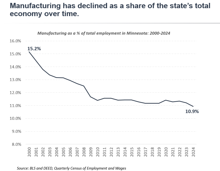 Minnesota’s manufacturing sector plays an outsized role in the state’s economy. It is the state’s second largest sector and has a disproportionate impact on other industries. When manufacturing grows, it spurs activity in construction, real estate, professional services, utilities and other industries that supply the needs of local manufacturers.
