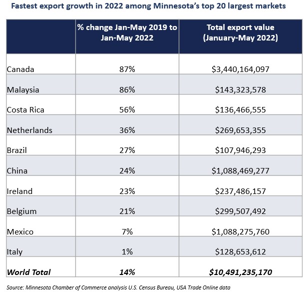 The Minnesota Chamber of Commerce’s Grow Minnesota! team will continue exploring these exporting trends in the coming months and offer assistance to connect Minnesota businesses to resources that can help them export their goods and services abroad.