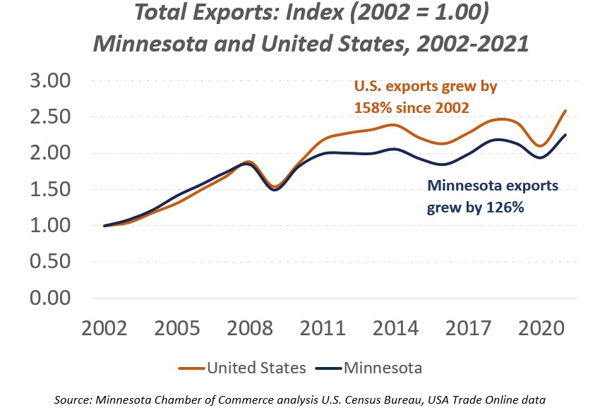 1. Minnesota surpassed pre-pandemic export levels in 2021 but recovery trailed U.S. growth, following a longer-term trend.