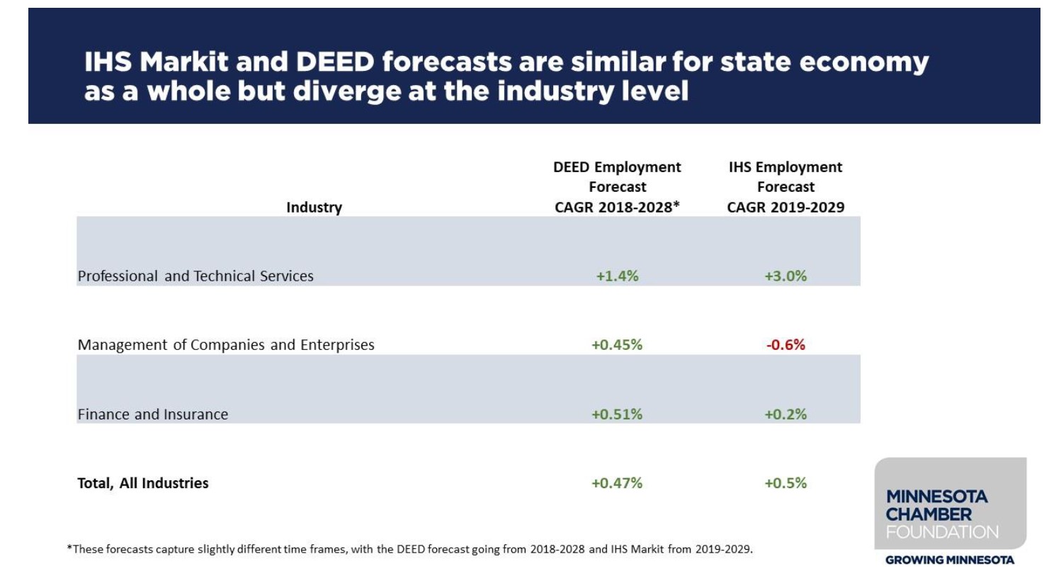 The Minnesota Department of Employment and Economic Development (DEED) forecasts a more balanced mix than the IHS Markit forecast, projecting modest growth in management of companies of 0.45% annually from 2018-2028, and professional services growth at a pace of 1.4% annually. The difference in time frame between the two prevents a direct comparison, but this contrast may also demonstrate a level of uncertainty and the range of possible outcomes involved in such future-looking exercises.