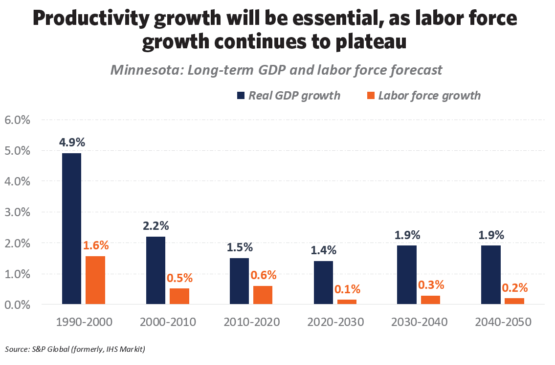 Productivity will be the key driver of future economic growth in Minnesota, as the state’s labor force is projected to remain relatively flat in coming decades. Minnesota grew its labor force by just 0.5% since January 2020 and is projected to grow by less than half a percent annually in the coming years. This will put greater reliance on productivity to drive overall gains in the economy.