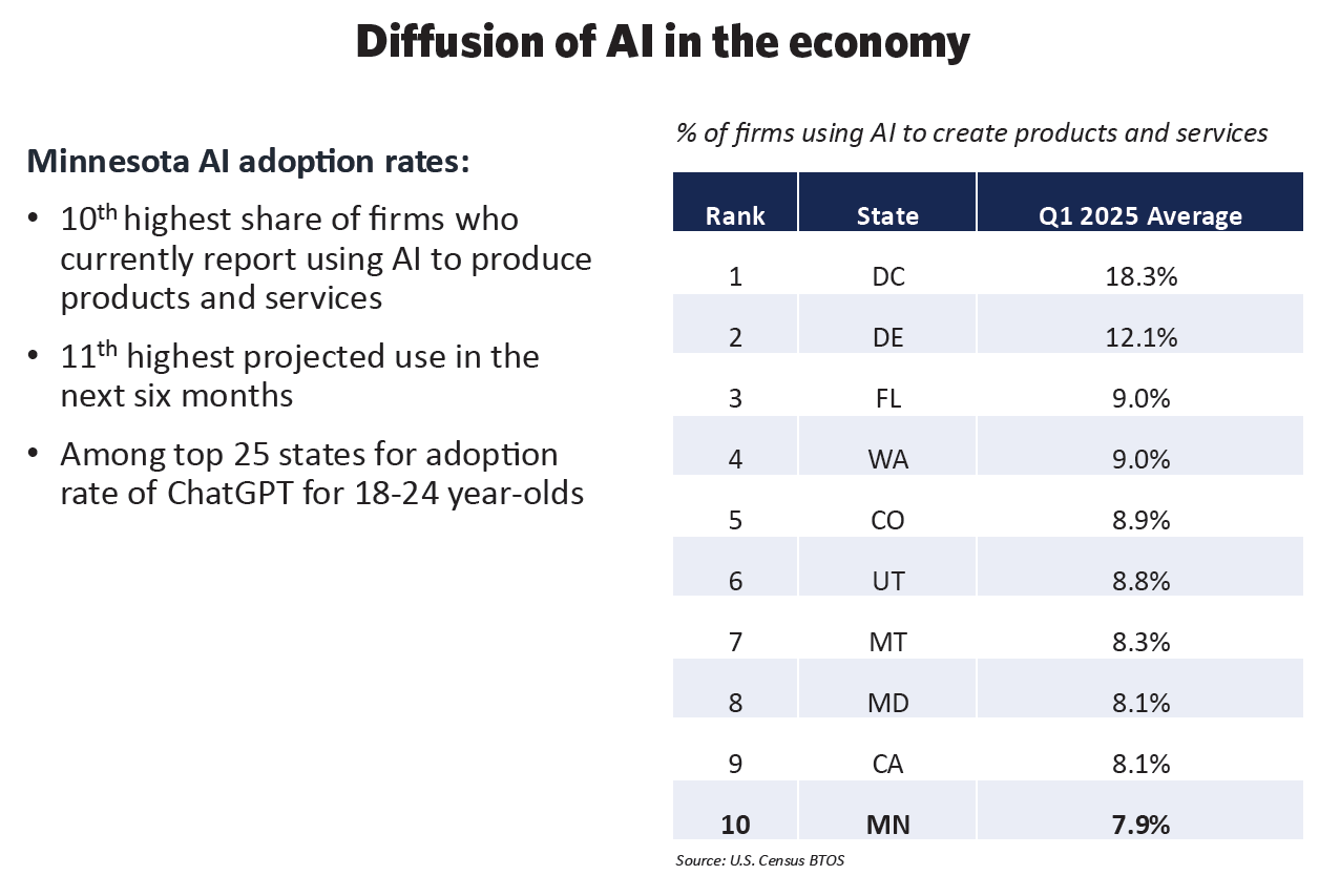 Despite Minnesota’s recent slowdown in productivity, broader shifts in the national and global economy offer important opportunities for acceleration. Two trends stand out in particular: the rapid advancement of Artificial Intelligence (AI) and a growing consensus around increasing domestic investment in U.S. manufacturing, energy and natural resources. Together, these forces have the potential to reshape productivity growth in Minnesota over the next decade. Advancements in Artificial Intelligence Advancements in AI—especially generative and emerging agentic forms—are poised to impact future productivity growth and labor markets in profound ways. While the long-term effects are still uncertain, the potential impacts are large. Below is a preliminary review of what we know about AI in Minnesota and how it compares to national trends.