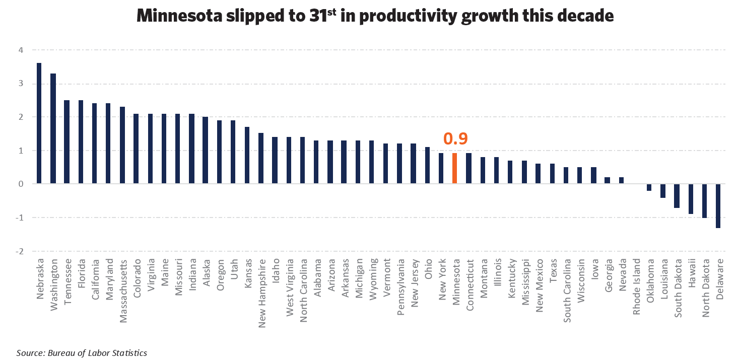- From 2007 to 2019, Minnesota’s labor productivity grew at just 1.2% annually – well below the U.S. long-run average. Since 2019, labor productivity growth has slowed further to just 0.9% per year, with Minnesota falling to 31st in the nation.