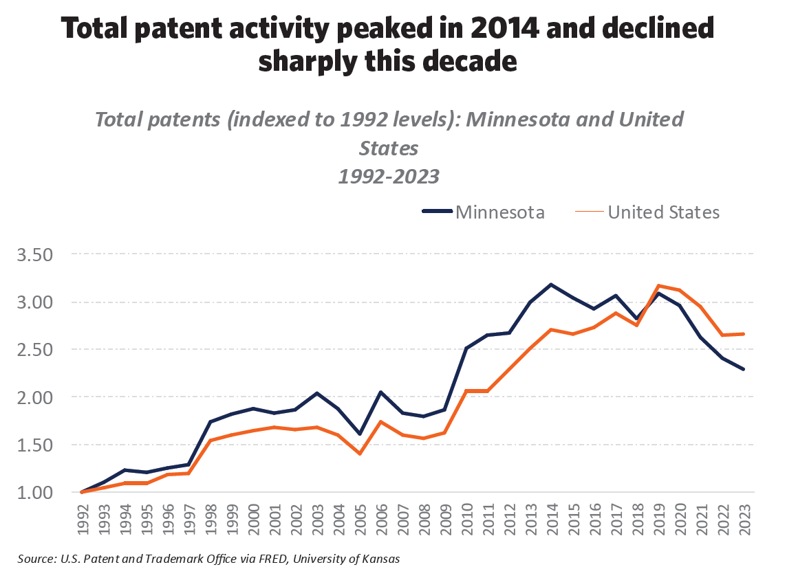 - While Minnesota still ranks 6th in patents per capita, the volume of new patents peaked in 2014 and has declined steadily since—with a particularly sharp drop this decade. Between 2013 and 2023, Minnesota ranked 47th in patent growth, experiencing one of the steepest declines in the country.
