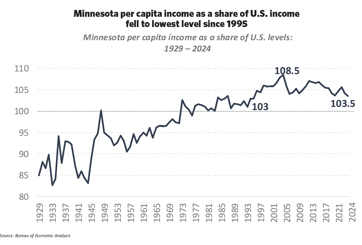 Slowing productivity and economic growth has led to a decline in Minnesota’s per capita income and GDP advantages relative to the U.S. economy. Minnesota per capita incomes grew 40th fastest among states from 2004-2024 and grew 35th fastest since 2014. Minnesota’s per capita incomes have exceeded U.S. levels every year since 1973, but that advantage declined over the past two decades. By 2024, Minnesota’s per capita income was just 3.5% higher than the U.S. average, marking the state’s narrowest income margin over the nation since 1995.
