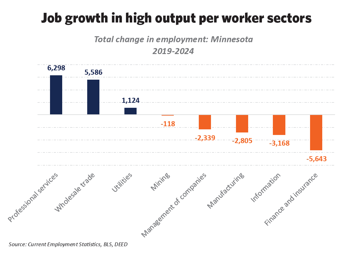 - In Minnesota, industries such as mining, utilities and information have labor productivity nearly 10 times higher than sectors like hospitality. Growth in capital-intensive industries tends to generate larger productivity and income gains.